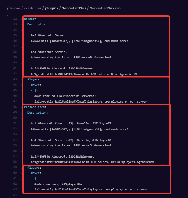 After enabling the plugin, you can start customizing the MOTD by changing the configuration of the ServerListPlus.yml file. The file can be found in the following directory: /plugins/ServerListPlus/ServerListPlus.yml.