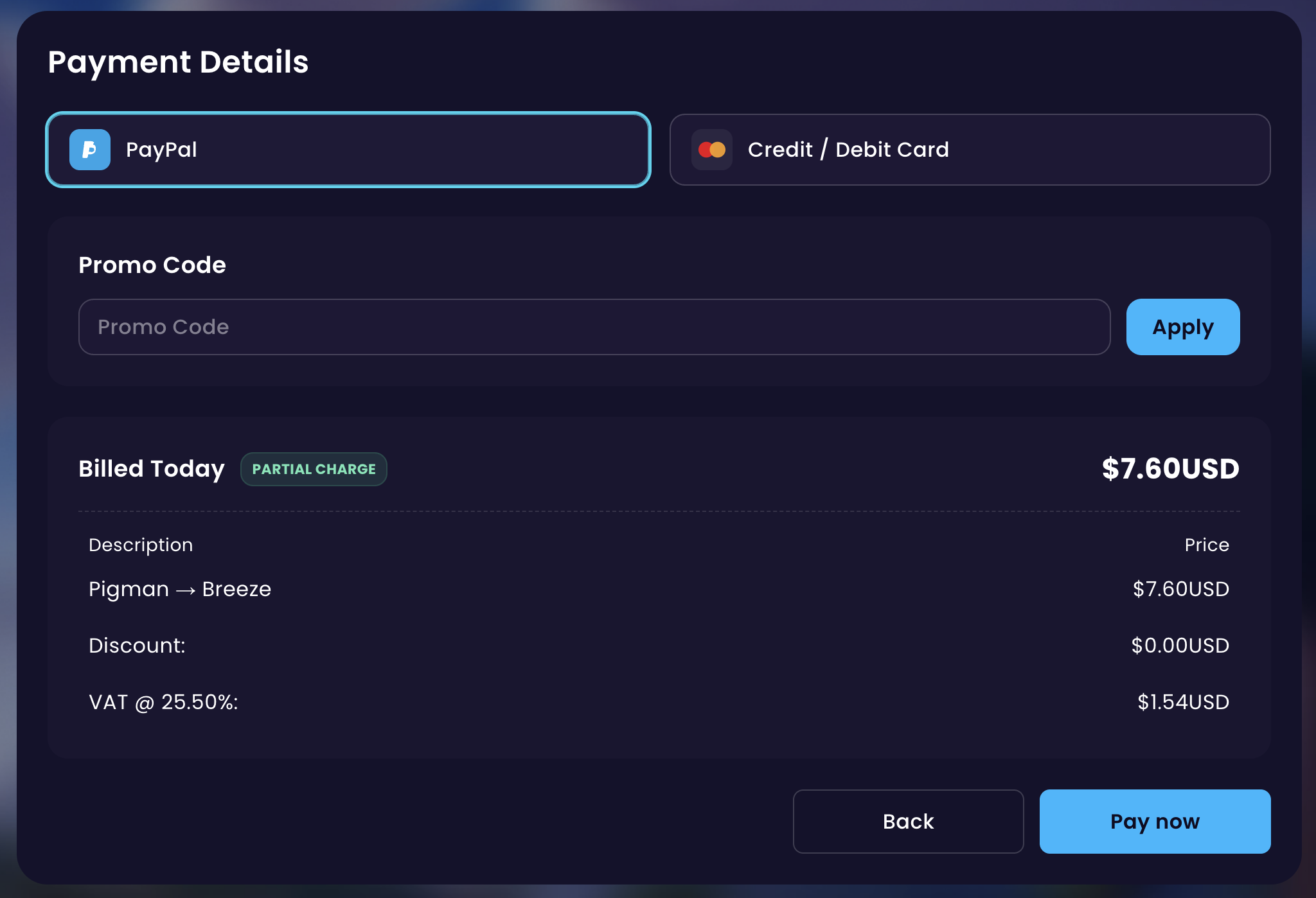 After that you will be shown a page where you will see the Billed Today - you will only need to pay the difference, not the full price of the package. Confirm this by clicking on the Pay Now -button.