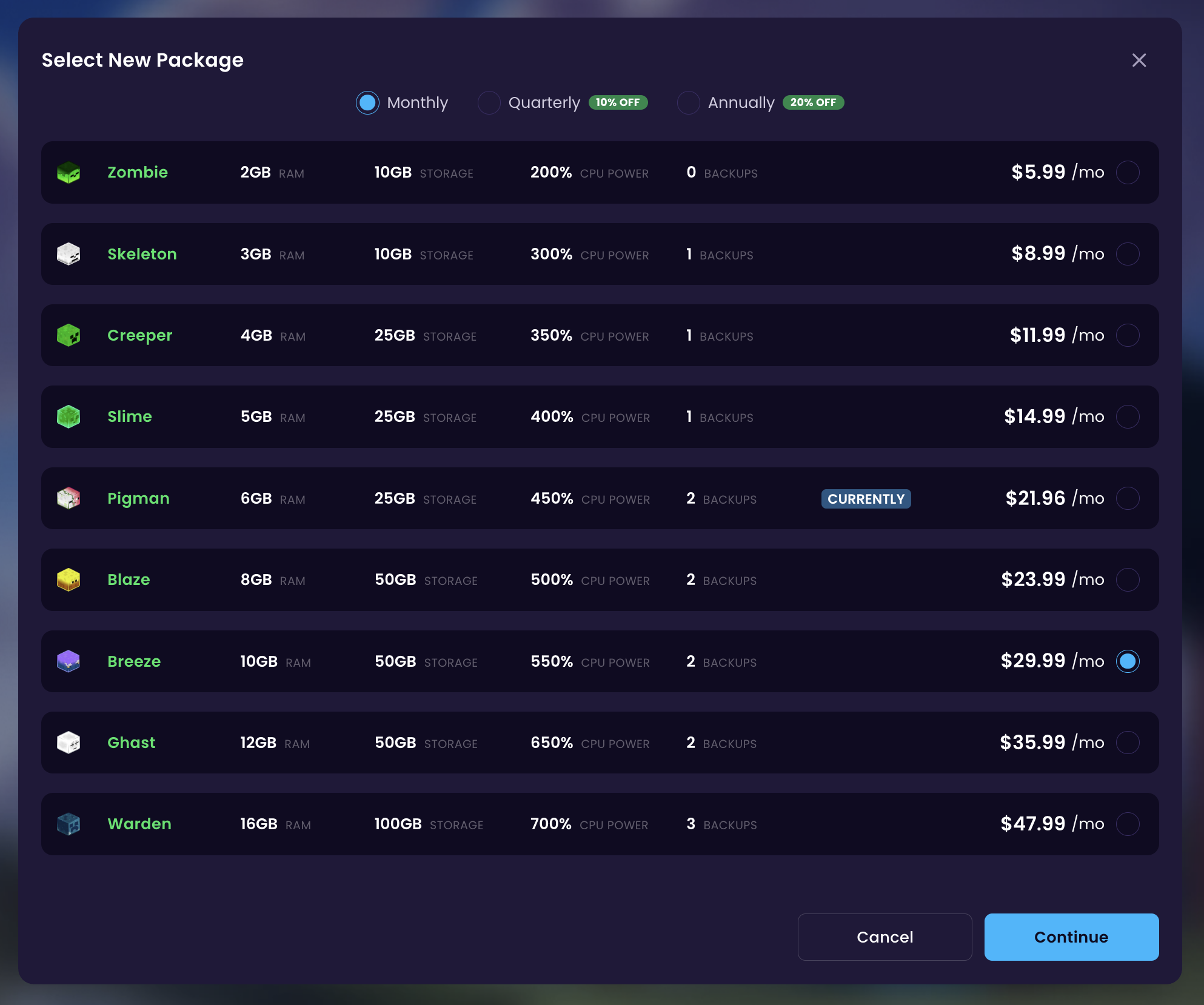 In here you have the option to choose the new package and the billing cycle. I'm going to be upgrading from Pigman to Breeze. When selected, click on Continue.