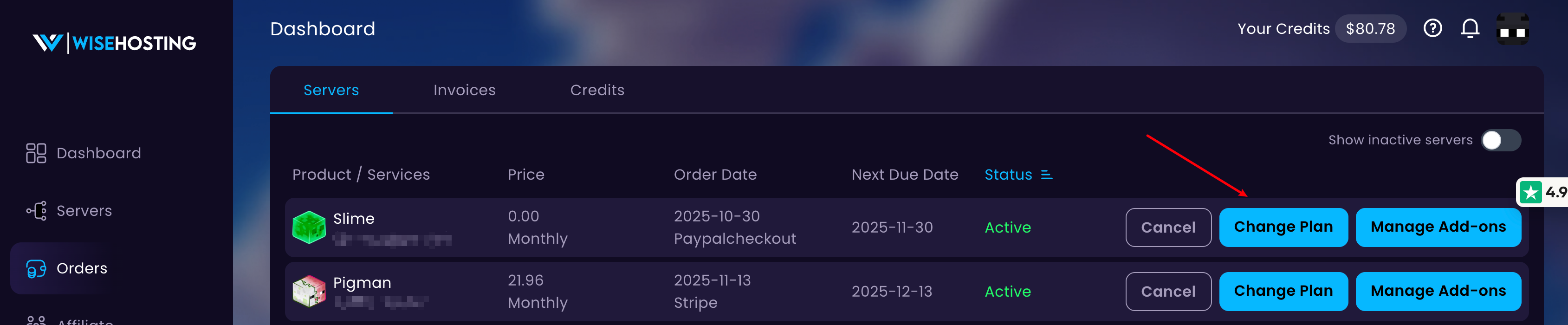 Click on the Orders tab and pick the server you'd like to upgrade or downgrade by clicking on Change Plan.